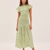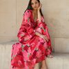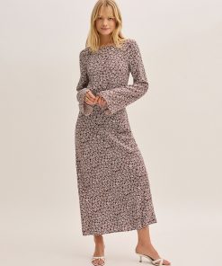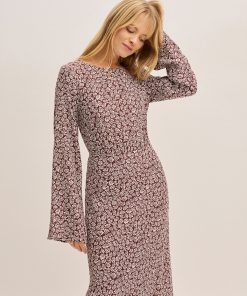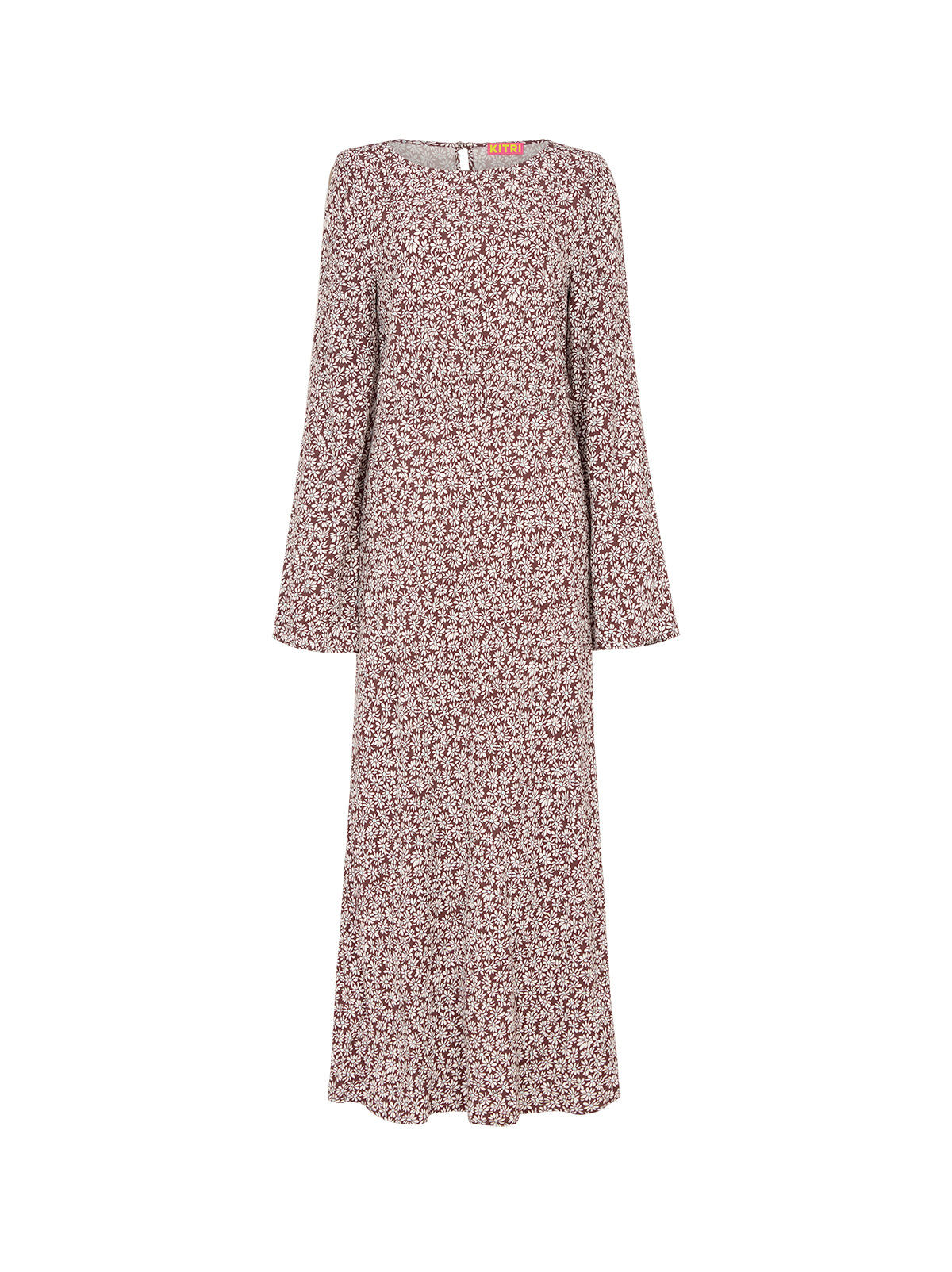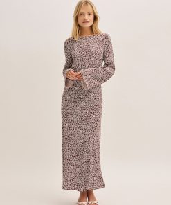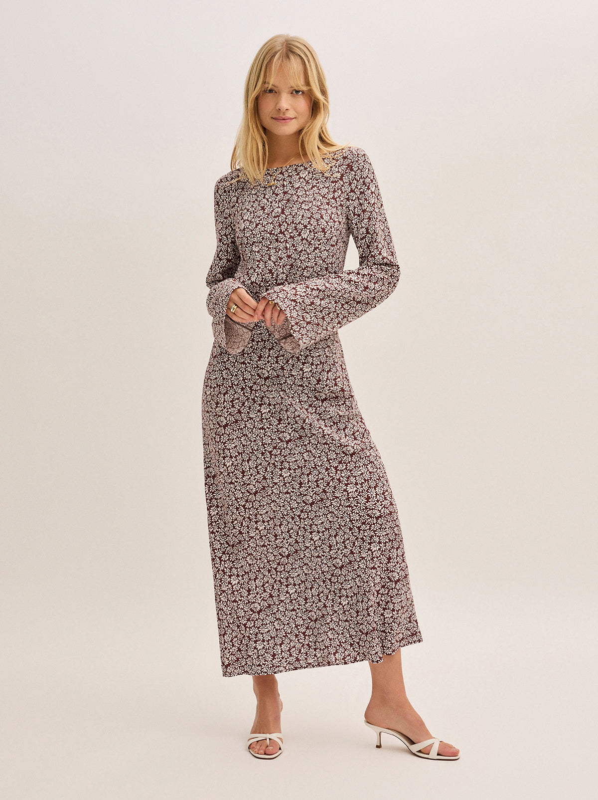 She’s demure. The Adaline Aubergine Daisy Print Dress is an elegant maxi dress featuring a slashed neckline and flared sleeves for a refined yet effortless look. The gently gathered waist seam flows into a flattering, body-skimming bias cut skirt, ensuring a graceful silhouette. Designed in a delicate daisy print on a rich aubergine base, this versatile dress will be your go-to all year long. Pair with boots for a daytime ensemble or elevate with heels for an elegant evening look.
