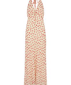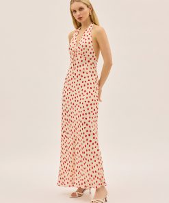 Playful, feminine and cut to flatter, Amalia is the dress everyone will ask about. Designed in a painterly red polka dot print, this halterneck maxi features a deep V neckline with delicate tie detail and a softly flared silhouette. Fully lined for ease and elegance, she’s the one you’ll reach for again and again – wedding guest days, late summer dinners, and everything in between.