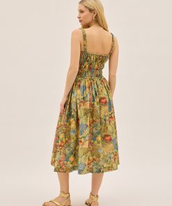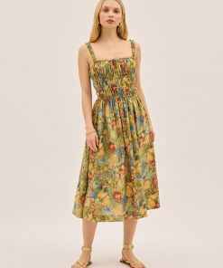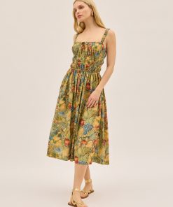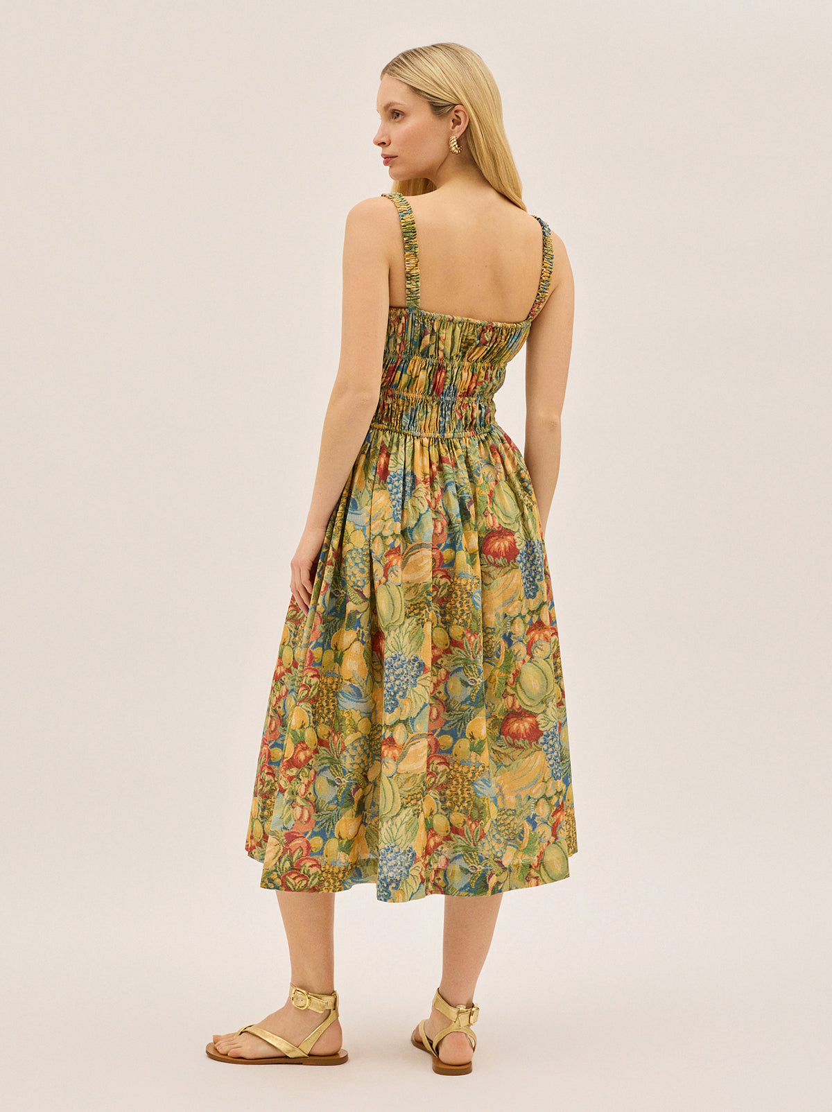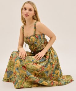 Joyful dressing, sorted. The Arya Dress is cut from a breathable linen blend in our painterly fruit print rich in colour, texture and sun-soaked charm. Designed with an elasticated bodice and gently ruched bust with tie detail, it offers a close, comfortable fit through the top before flowing into a full, easy skirt. Stretchy shoulder straps complete the relaxed, throw-on feel.