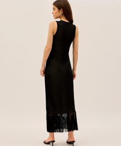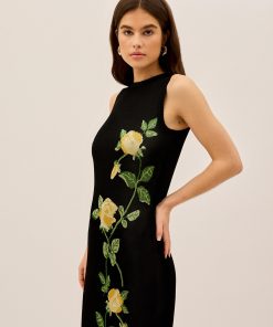 Sleek, sophisticated, and with just the right amount of edge—the Blanca Dress is here to turn heads. This midi knitted dress is designed for a flattering, figure-hugging fit, featuring a racer neckline and playful fringe detail at the hem for extra movement. The yellow rose motif jacquard adds a striking contrast against the black viscose knit, while the subtle sheen finish gives it a luxe feel.