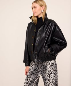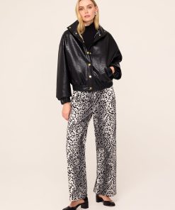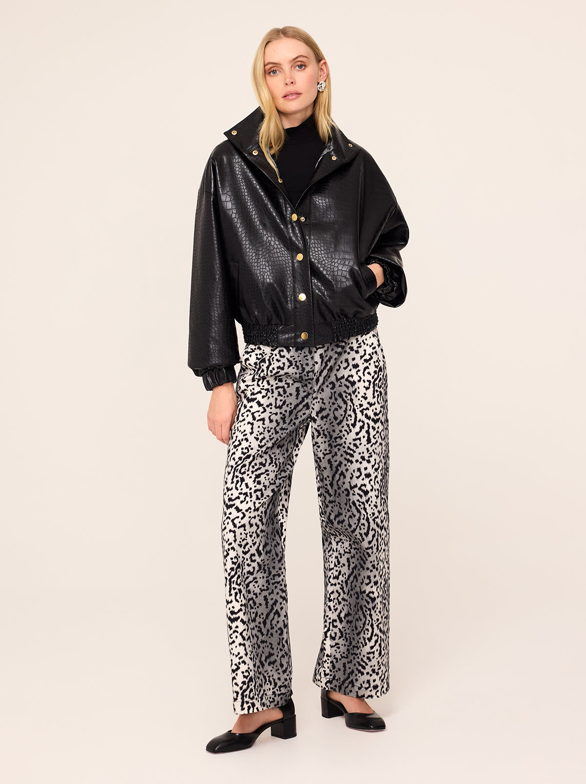 We’re mad about Estelle. This slouchy, matte faux croc vinyl bomber jacket is the newest silhouette in our vinyl collection. Featuring elasticated hem detail, gold metal popper fastening and wide funnel neck, this contemporary take on the classic bomber jacket is a more casual option to the Valeria Trench Coat. Fully lined in the graphic snow leopard print, she’ll look just as good hanging up as she is when worn.