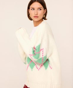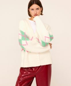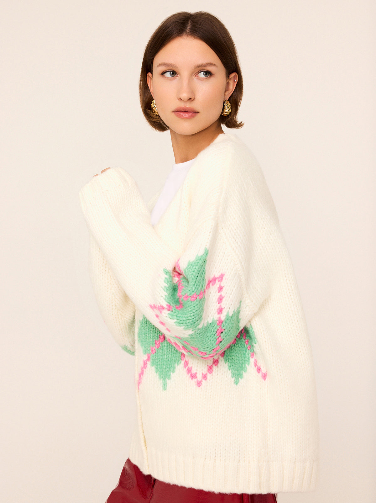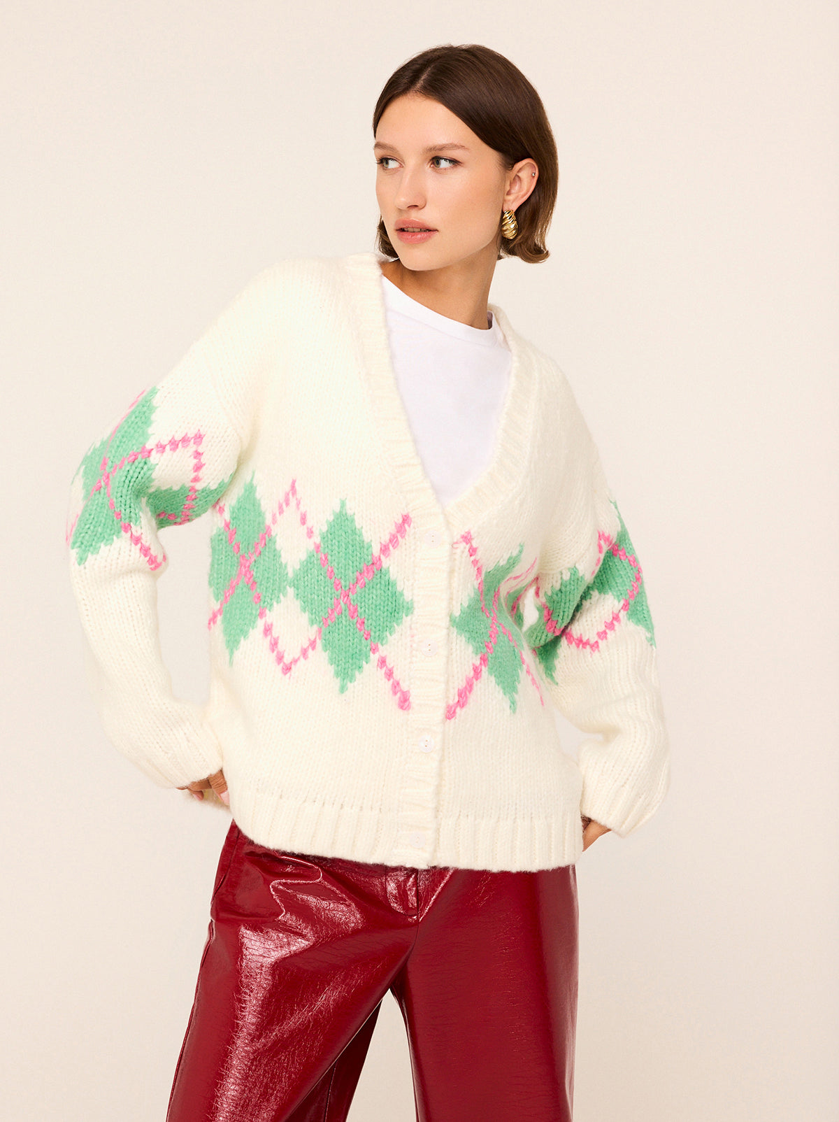 KITRI Women’s Felicia Ivory Argyle V-neck Knit Cardigan | Ivory Argyle