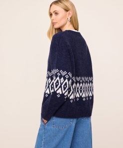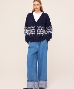 KITRI Women’s Felicia Navy Fairisle V-neck Knit Cardigan | Navy Fairisle