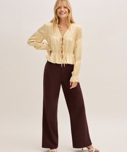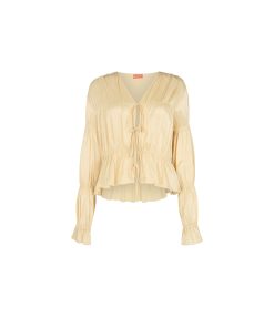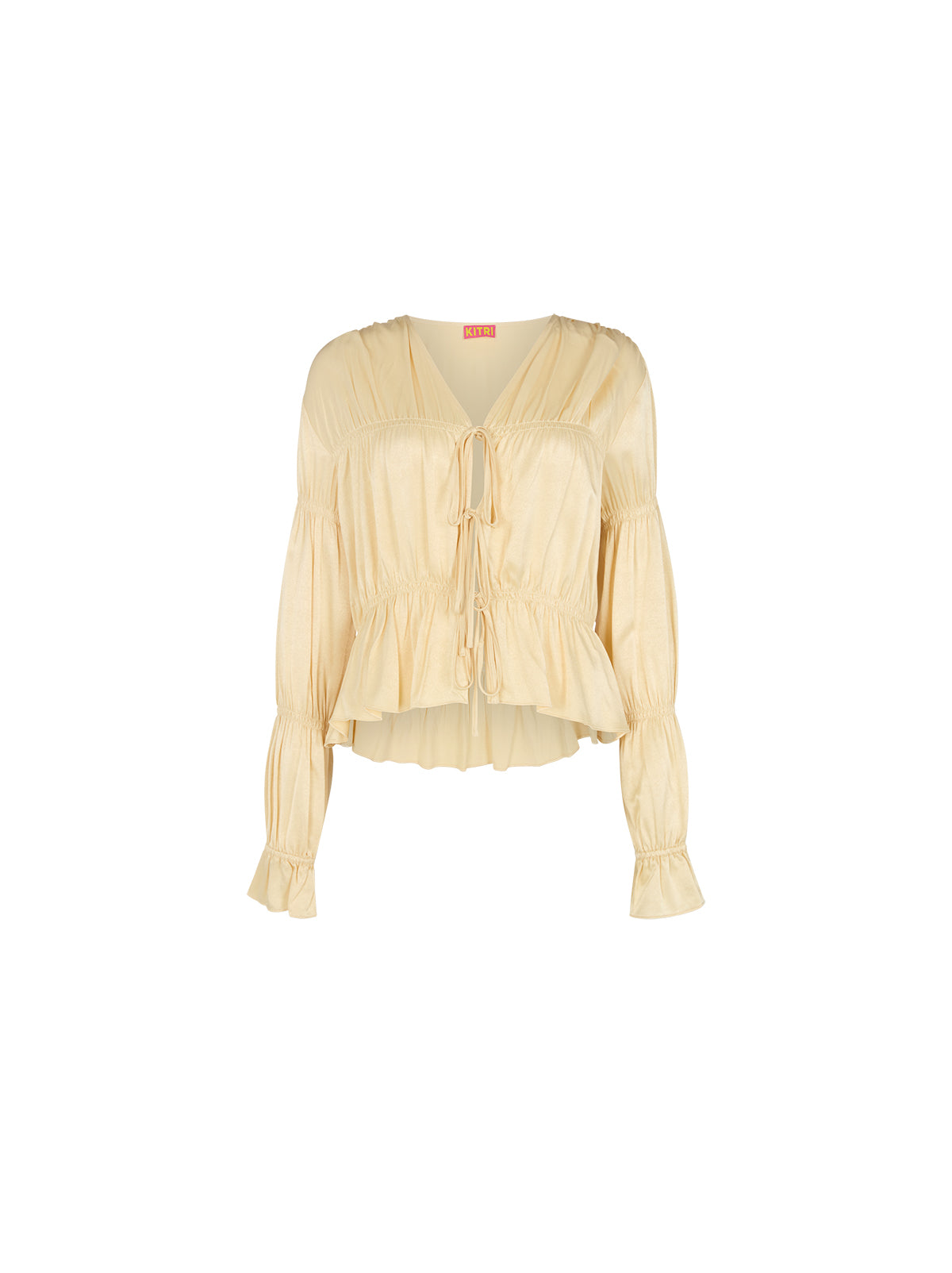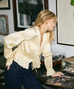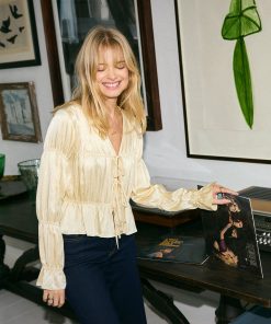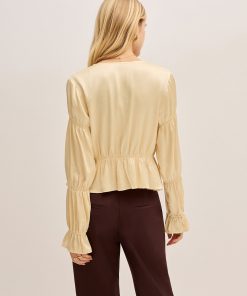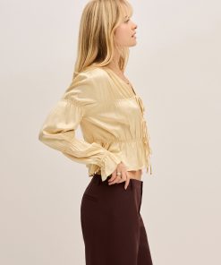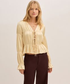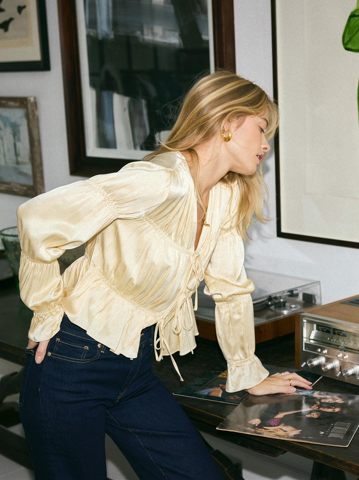 Minimal effort, maximum impact. Meet Maia in butter yellow satin—the boho blouse of your Spring wardrobe dreams. Adorned with our signature ties down the front and romantic frilled cuffs, she’s crafted from luxurious liquid satin for a soft, elegant finish. Take her from day to night effortlessly; the hidden buttons behind each tie keep everything secure, so you won’t have to worry about wardrobe malfunctions. Maia truly is a luxe satin women’s top that’s ready to shine this Spring.