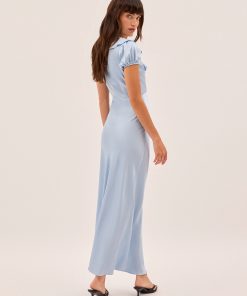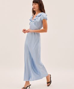 Introducing the Minka dress – a new romantic silhouette in a dreamy powder blue hue. Crafted from fluid viscose satin and bias-cut for an elegant drape, it features a flattering empire line, deep V-neckline with soft frill detail, and short puff sleeves. Perfect for summer soirées or special moments, it’s a fresh take on occasion dressing with vintage charm.