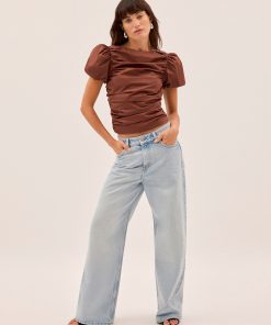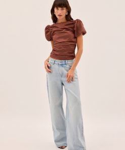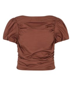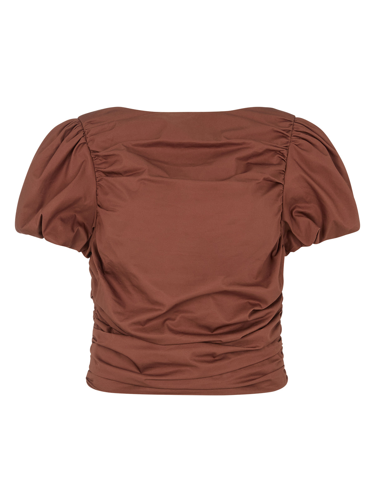 The Nyla top is an elevated essential crafted from mid-weight cotton in a rich sienna shade. Designed with a wide boat neckline and voluminous puffed short sleeves, it features flattering ruching through the body and a slim, sculpted fit. A versatile day-to-night piece that pairs effortlessly with denim or tailoring.