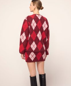 KITRI Women’s Pandora Burgundy Argyle Knit Cardigan | Burgundy Argyle