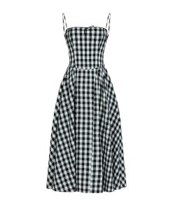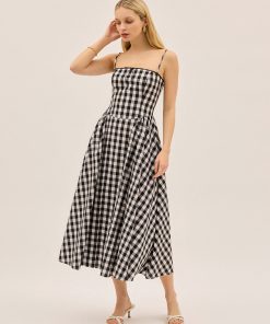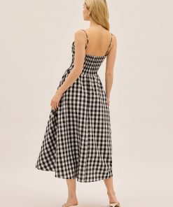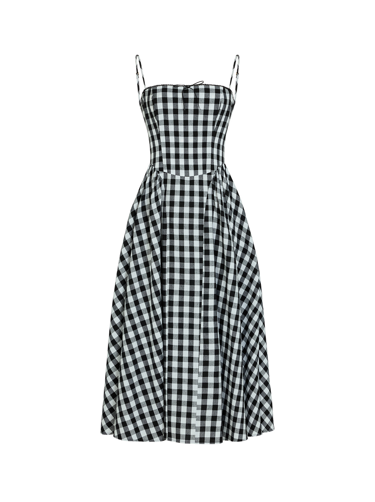 An update on our bestselling Alberta dress, Sabrina is made from a lightweight linen blend in timeless black gingham. Featuring delicate spaghetti straps, a black ribbon bow at the neckline and a full, panelled skirt designed for movement. A sweet nod to vintage silhouettes with a modern, wearable feel.