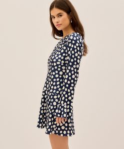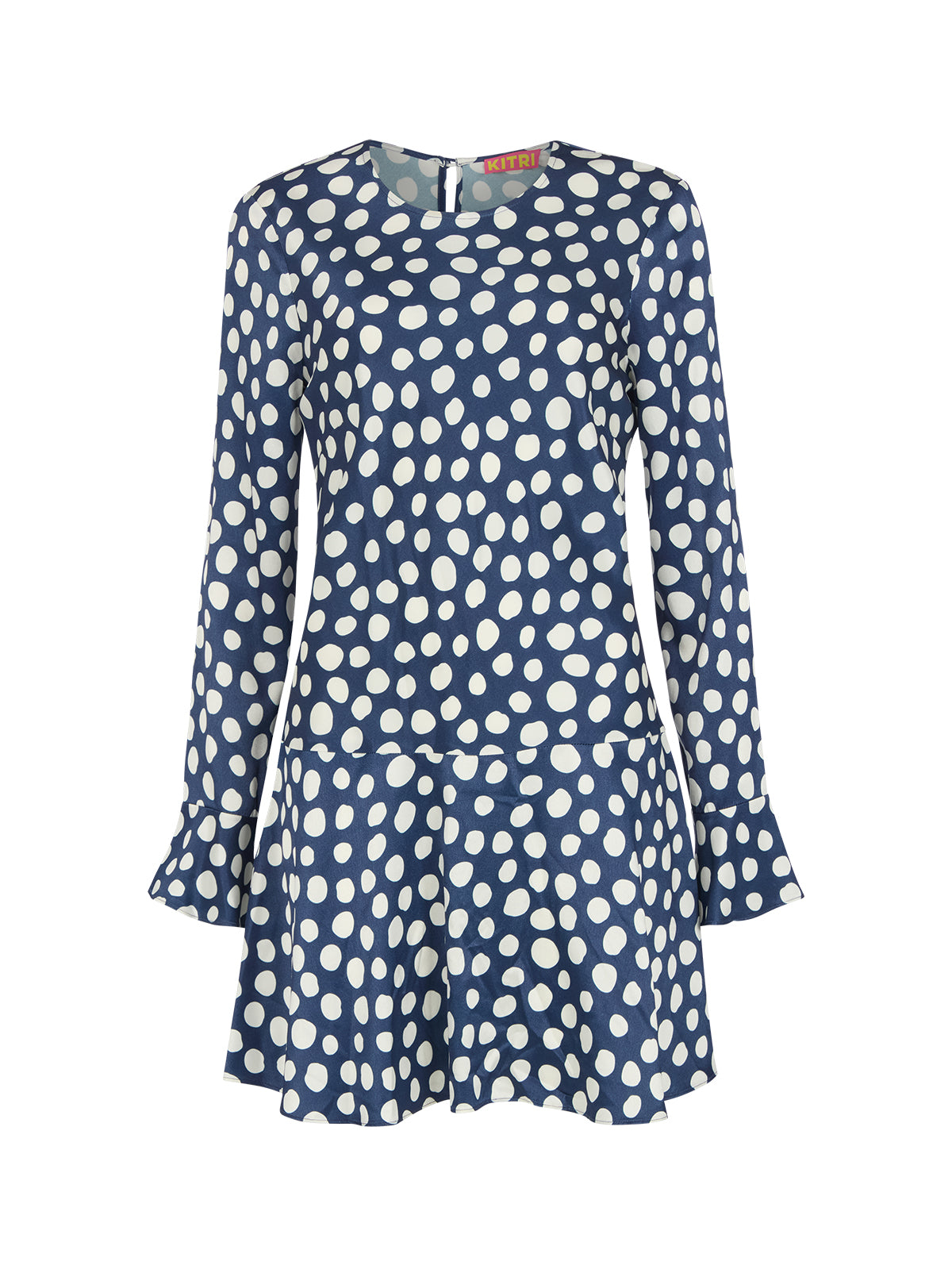 Flirty, fun, and effortlessly chic—the Stefania Mini Dress is your new go-to for day-to-night dressing. Designed in fluid satin with a timeless navy polka dot print, this long-sleeve mini dress features fluted cuffs and a softly flared hem for the perfect touch of movement.