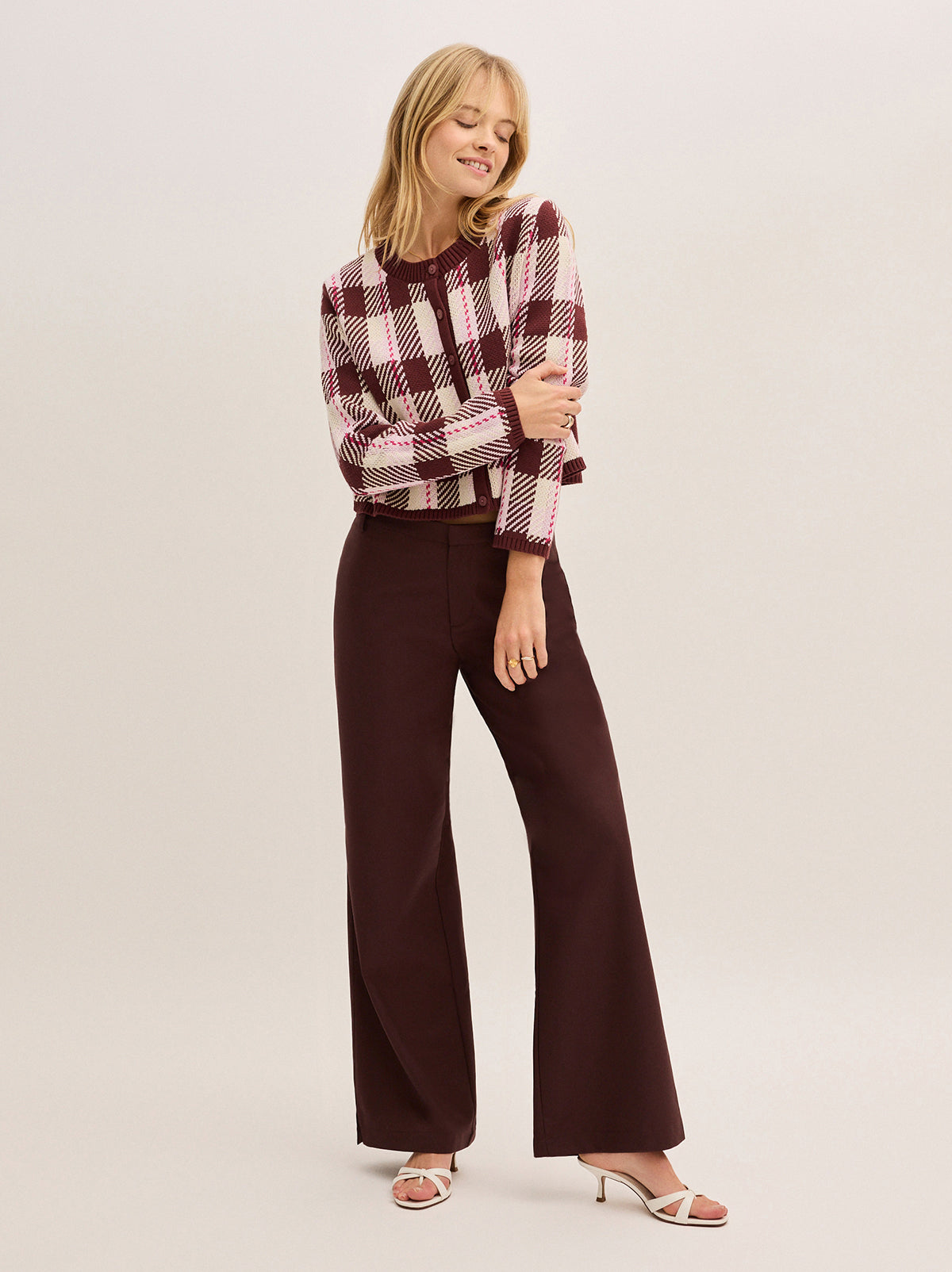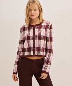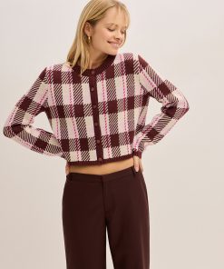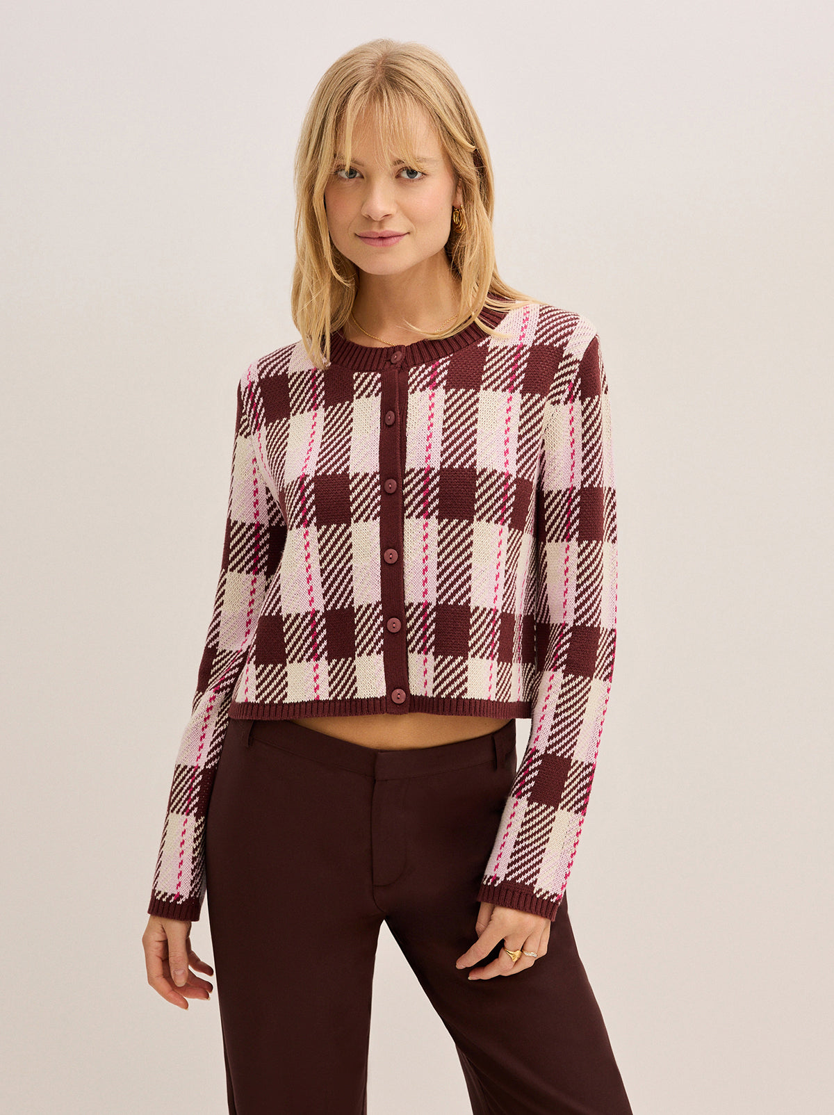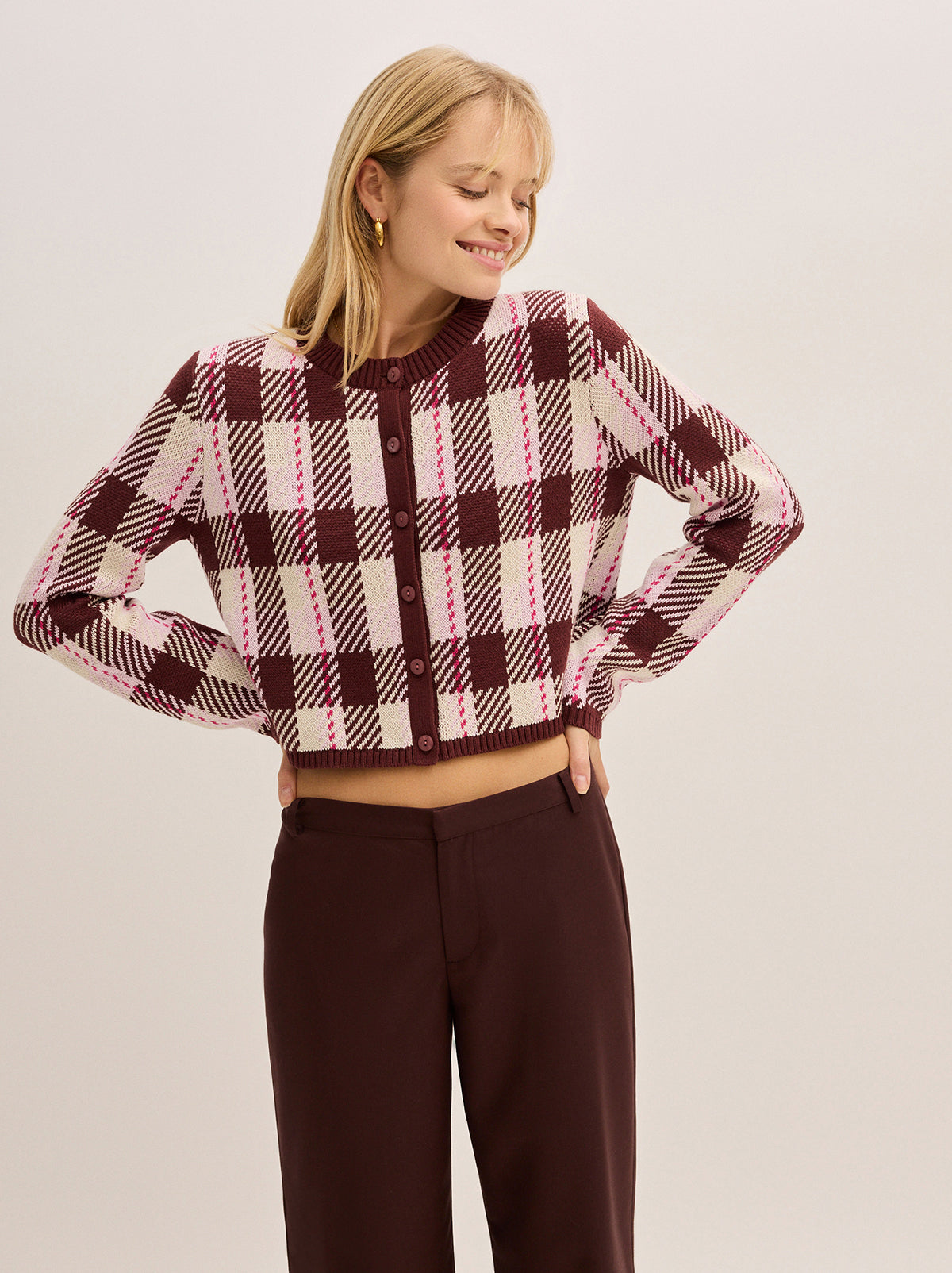 The Ulla Pink Check Cardigan is the ultimate versatile knit cardigan crafted from mid-weight yarn, perfect for wearing all season. Featuring a classic check pattern in a feminine colour palette of mocha, cream, and a pop of fuchsia pink, this round-neck button front cardigan pairs effortlessly with the Helena Mocha Trousers or your favourite denim for a polished look.