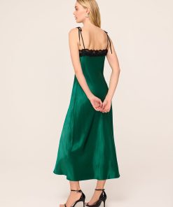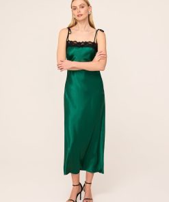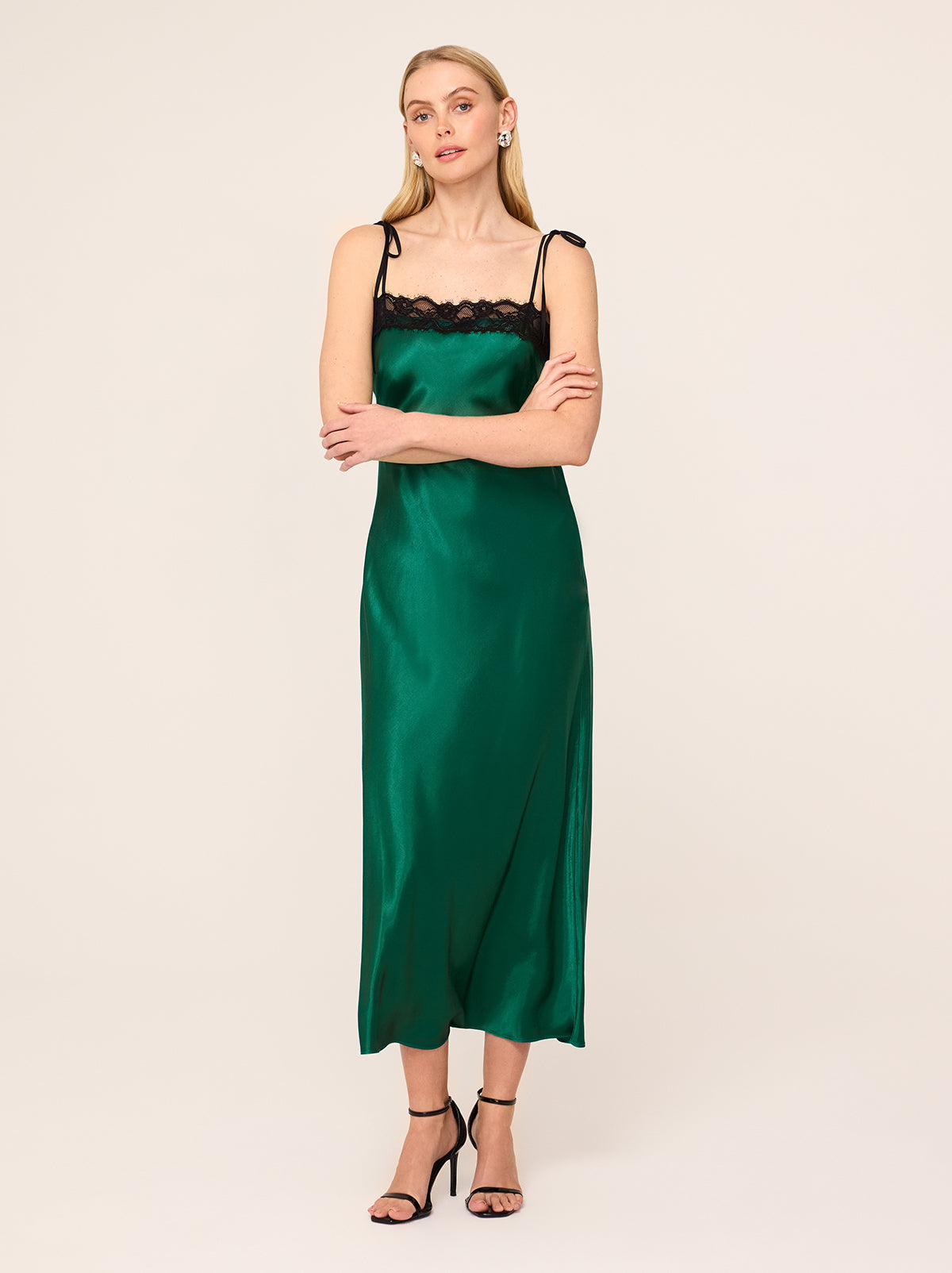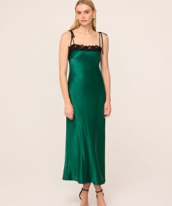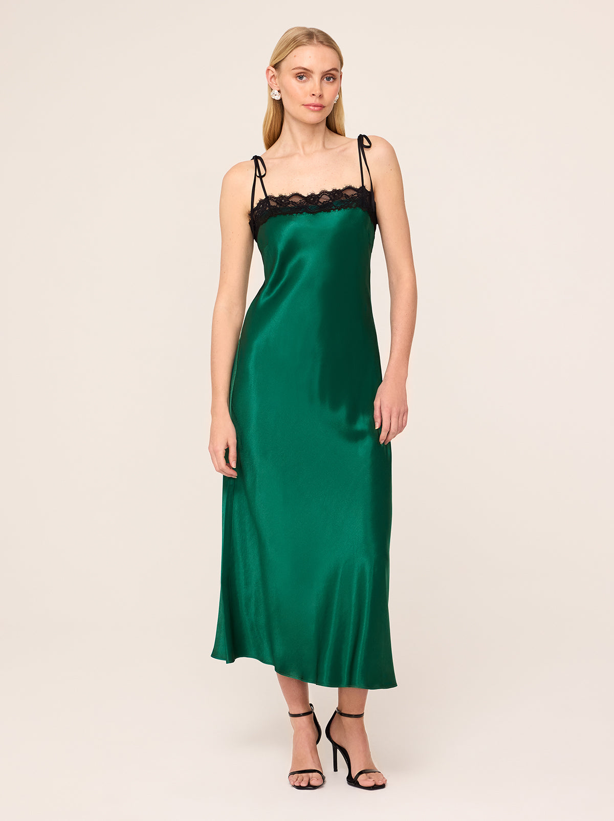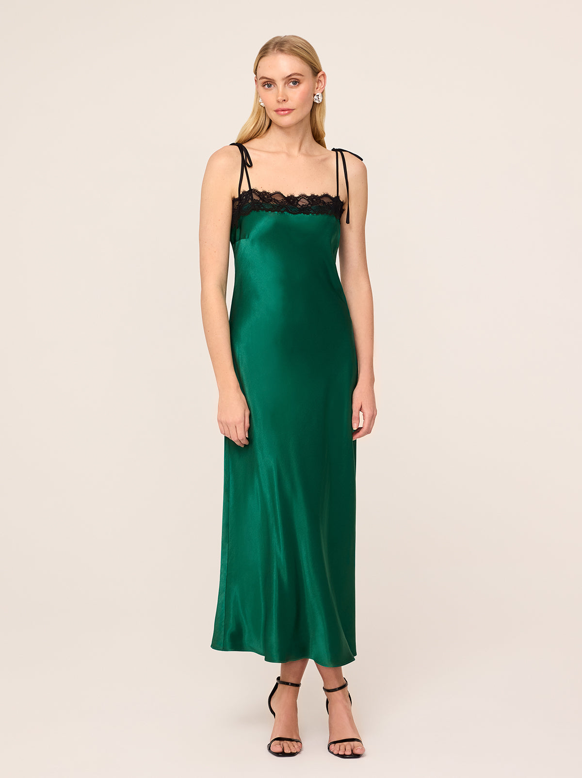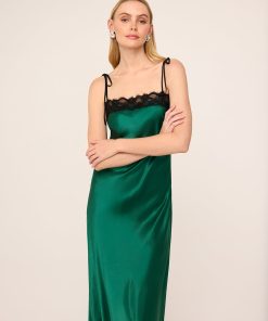Be the best dressed guest. Venetia is the ultimate statement maxi dress, crafted from luxurious emerald green heavyweight satin with a lustrous finish. Her bias-cut silhouette drapes beautifully, skimming the figure for an effortlessly flattering fit. The delicate black lace trim adds a touch of contrast and romantic detail, while adjustable spaghetti straps allow for a customised, comfortable fit. Perfect for any occasion, Venetia transitions seamlessly from day to evening – pair her with a fluffy knit and boots for a relaxed daytime look or elevate her with strappy heels for formal events and parties. Produced in limited quantities, Venetia is a wardrobe standout.