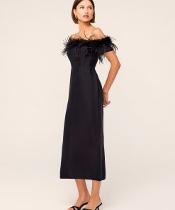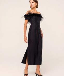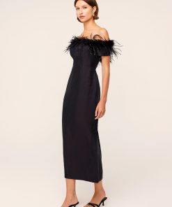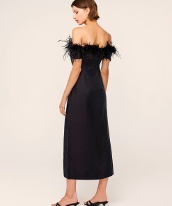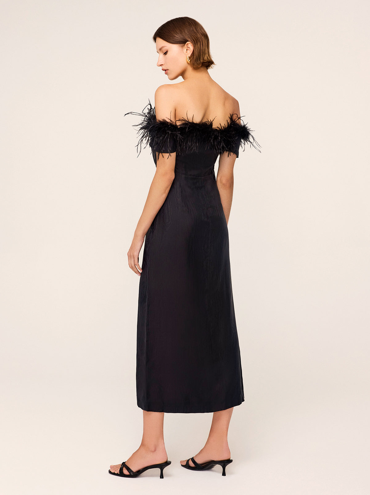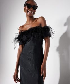 Effortlessly elegant with a glamorous twist, the Vivien Black Feather Dress is a show-stopper for any occasion. Crafted from premium black moir fabric, its subtle sheen and unique rippling effect create a sense of understated luxury. The strapless, fitted bodice hugs your figure in all the right places, while the feather detailing along the top adds a dramatic flair that’s perfect for a night to remember. Whether you’re heading to a formal event or a chic evening out, Vivien is your go-to for a look that exudes confidence and sophistication.